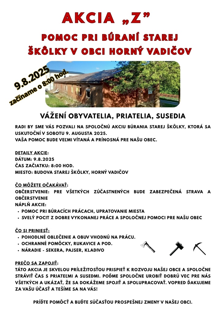 Milí spoluobčania príďte pomôcť pri búracích prácach v sobotu 9.8.2025. Začíname o 8:00 hod. ráno a pre všetkých zúčastnených bude zabezpečená strava a občerstvenie.