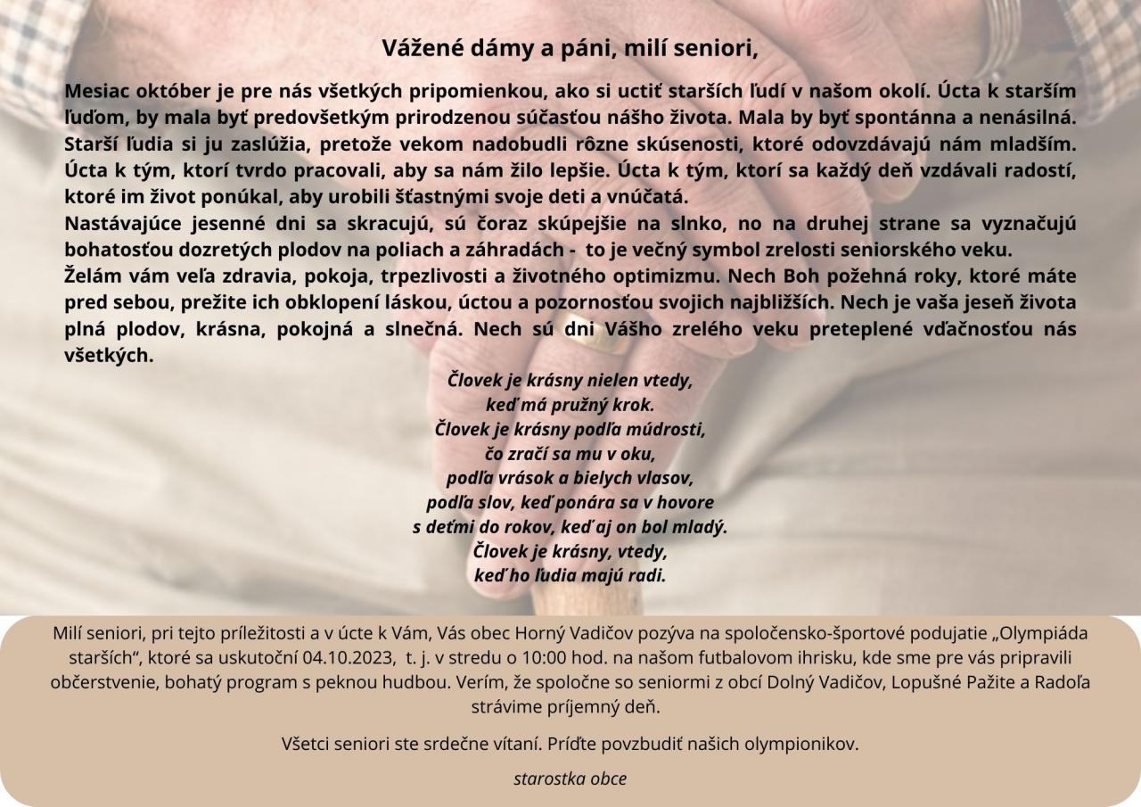 Mesiac Október bol v decembri 1990 Valným zhromaždením OSN vyhlásený za Mesiac úcty k starším. Tento mesiac je pre nás všetkých pripomienkou, že si máme vážiť a ctiť starých ľudí, dávať im najavo svoju náklonnosť a lásku.
