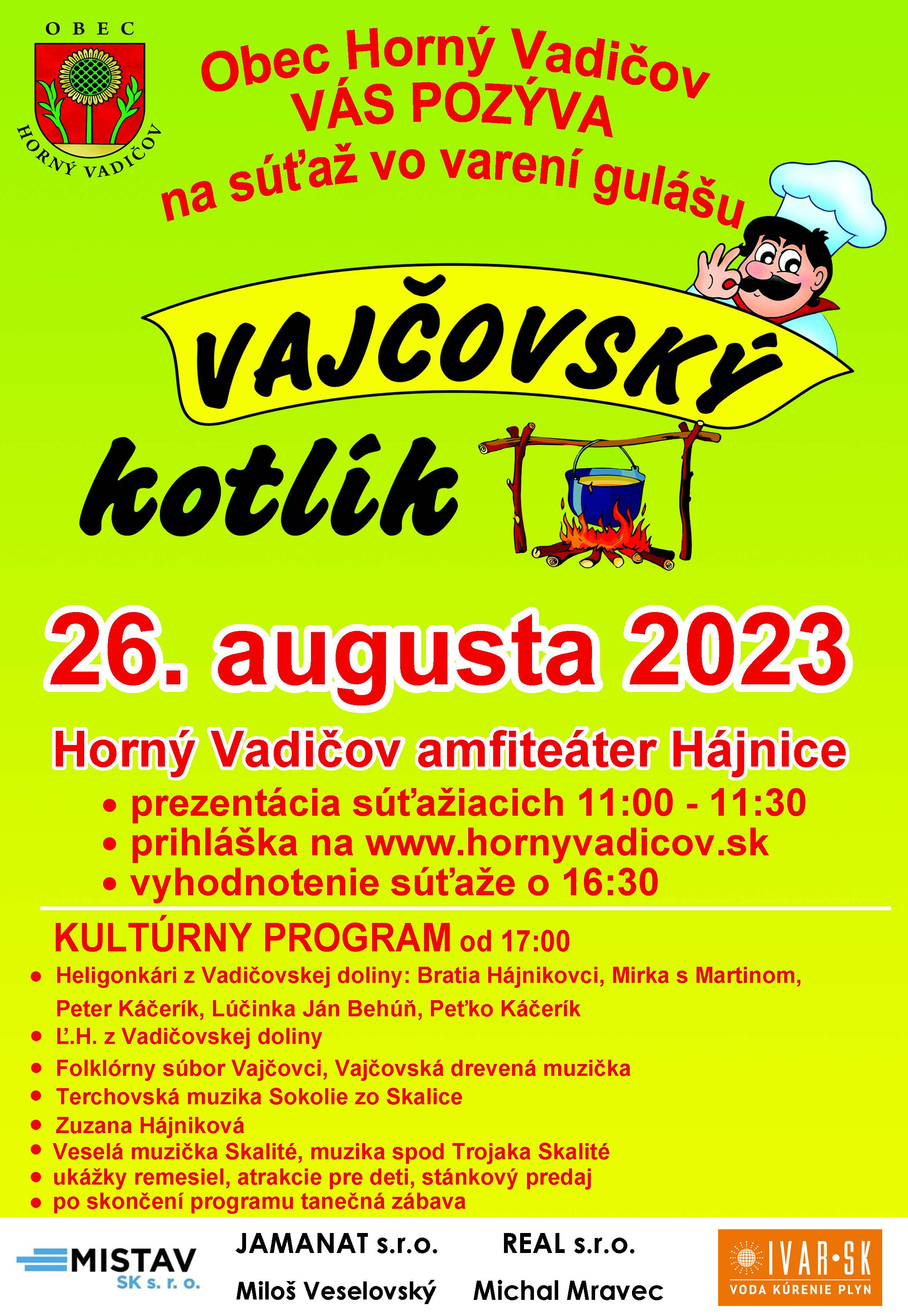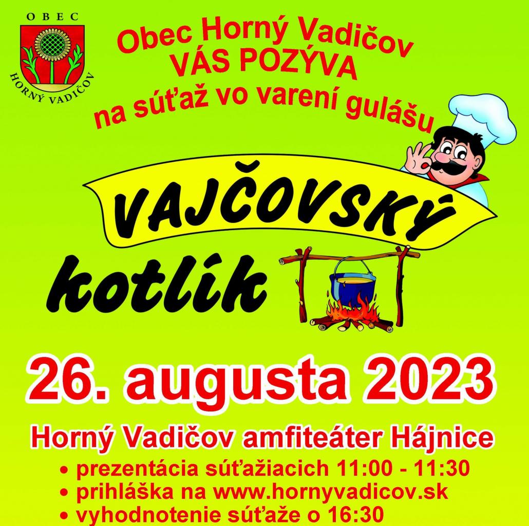 Pozývame všetkých milovníkov dobrého gulášu na súťaž v jeho varení na Hájniciach Hornom Vadičove. Prihlášky pre súťažné družstvá sú dostupné na Obecnom úrade, v pohostinstve ALFA, v potravinách Môj obchod a na webovej stránke obce.