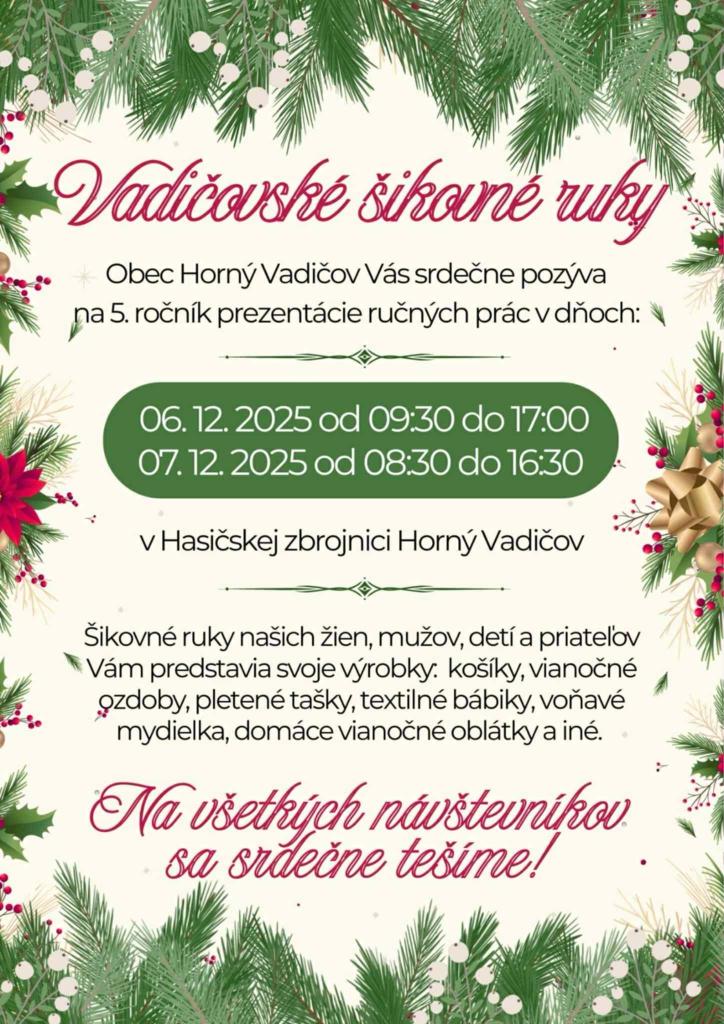 Srdečne Vás pozývame na výstavu ručných prác v sobotu 6.12.2025 od 9:30 hod. do 17:00 hod. a v nedeľu 7.12.2025 od 8:30 hod. do 16:30 hod. v Hasičskej zbrojnici Horný Vadičov.
