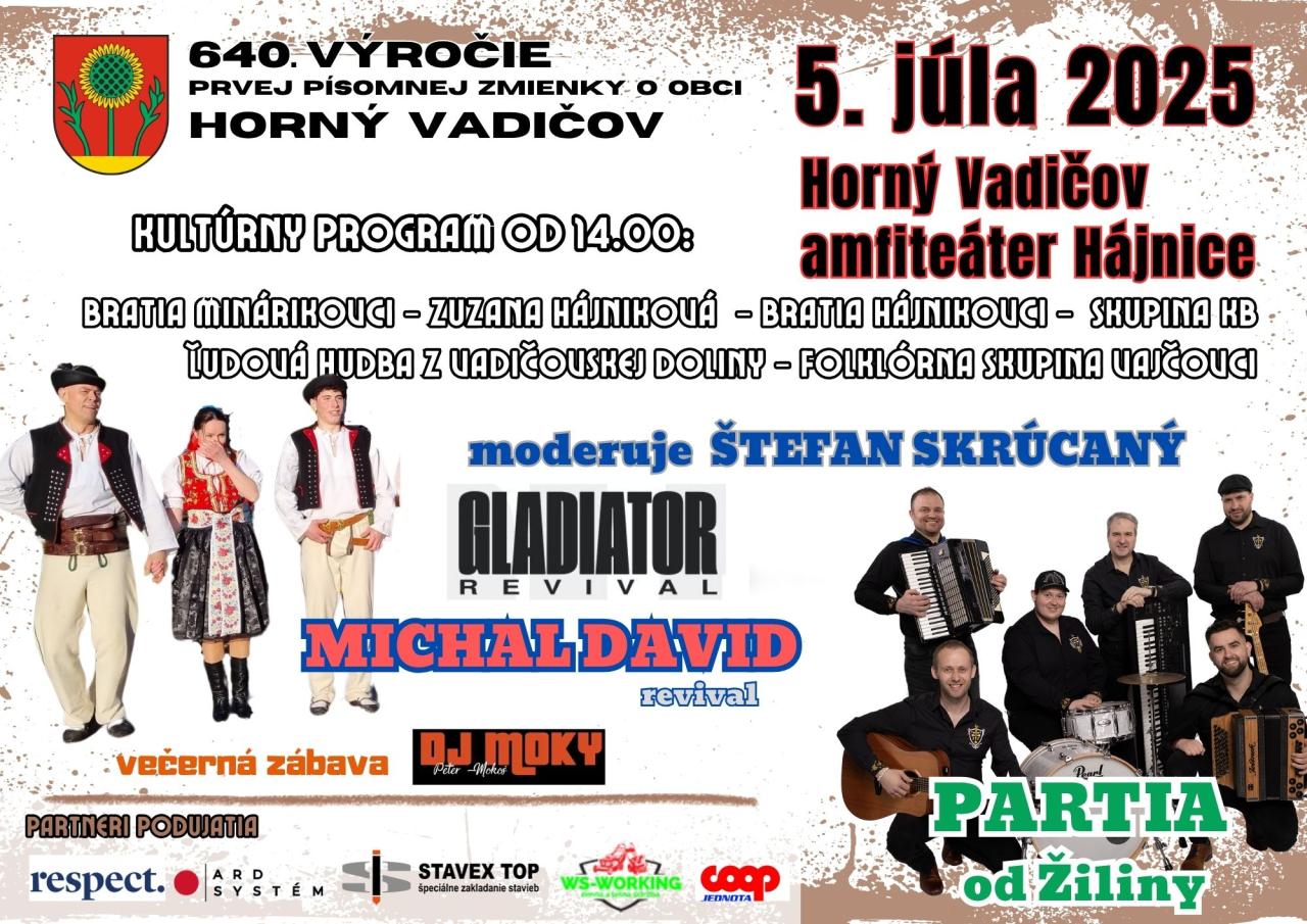Srdečne pozývame všetkých na Slávnosť pri príležitosti 640.výročia prvej písomnej zmienky o obci Horný Vadičov, ktorá sa bude konať v sobotu 5.7.2025 v Amfiteátri Hájnice so začiatkom o 14:00 hod.